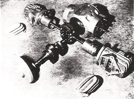 Cast of Alcoa 365 heat treated aluminum alloy, as are all the other aluminum castings, the two cylinder block contains many odd features. At first glance, the inside walls of the cylinders appear to be full of holes. These are the ports for intake and exhaust and their arrangement is one of the reasons why the engine is so successful. They replace, in effect, the operation of valves, cams and all the other breathing mechanisms upon which the conventional four stroke engine is so dependent.